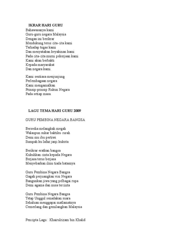 . Lafaz Ikrar Hari Guru Nyanyian Lagu Kami Guru Malaysia. Wabillahhitaufik walhidayah wassalamualaikum warrahmatullah hiwabarakatuh dan terima kasihSELAMAT HARI GURU. Perdana Menteri Datuk Seri Najib Tun Razak ketika tiba untuk merasmikan sambutan Hari Pekerja Peringkat.